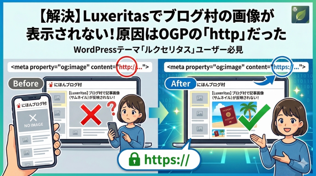 【Luxeritas】ブログ村で記事画像(サムネイル)が反映されない!原因はOGPの「http」だった?解決方法を徹底解説